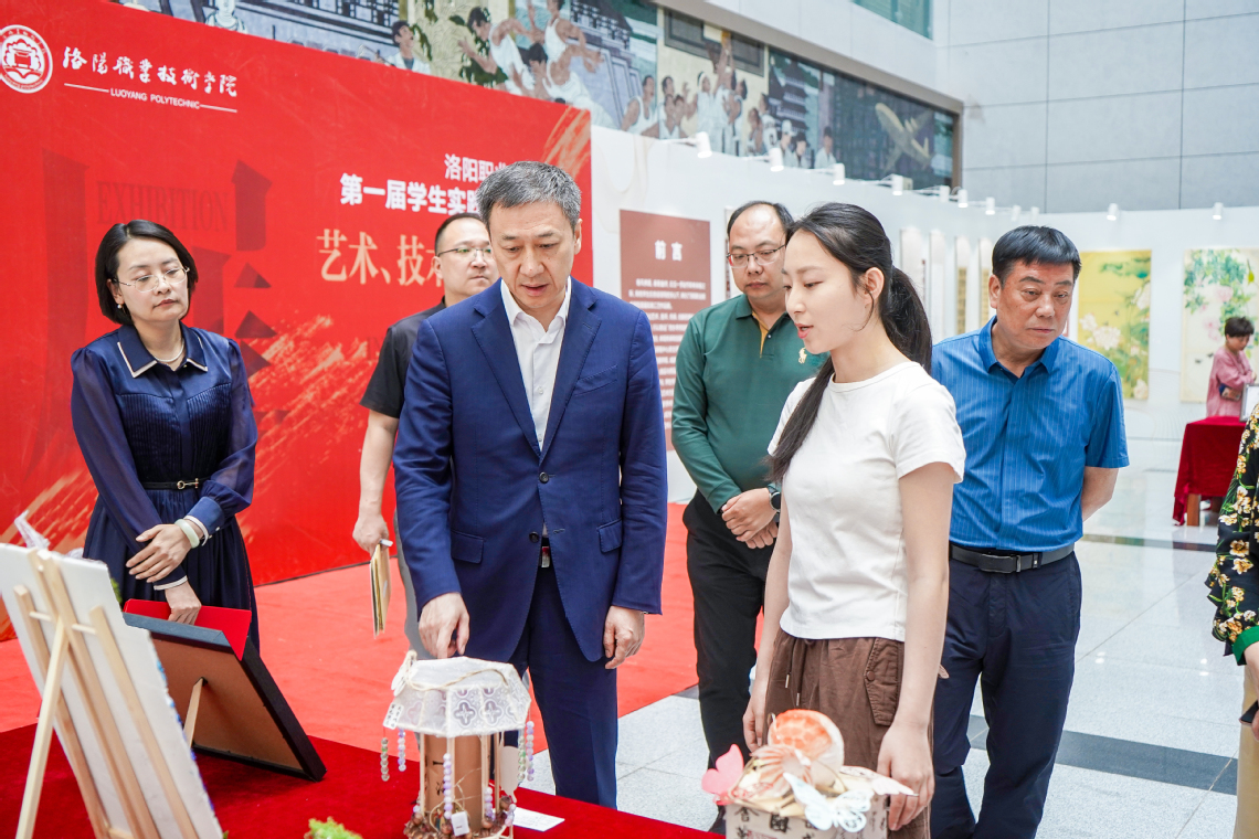 赵健认真查看参展作品,同师生深入交流,详细了解作品创作过程。他高度评价学生实践能力和创作技能,鼓励广大学生要认真学习专业知识,继续保持对艺术的热爱和对工匠精神的追求,不断提升综合素质和职业技能,努力创作出更多优秀作品。