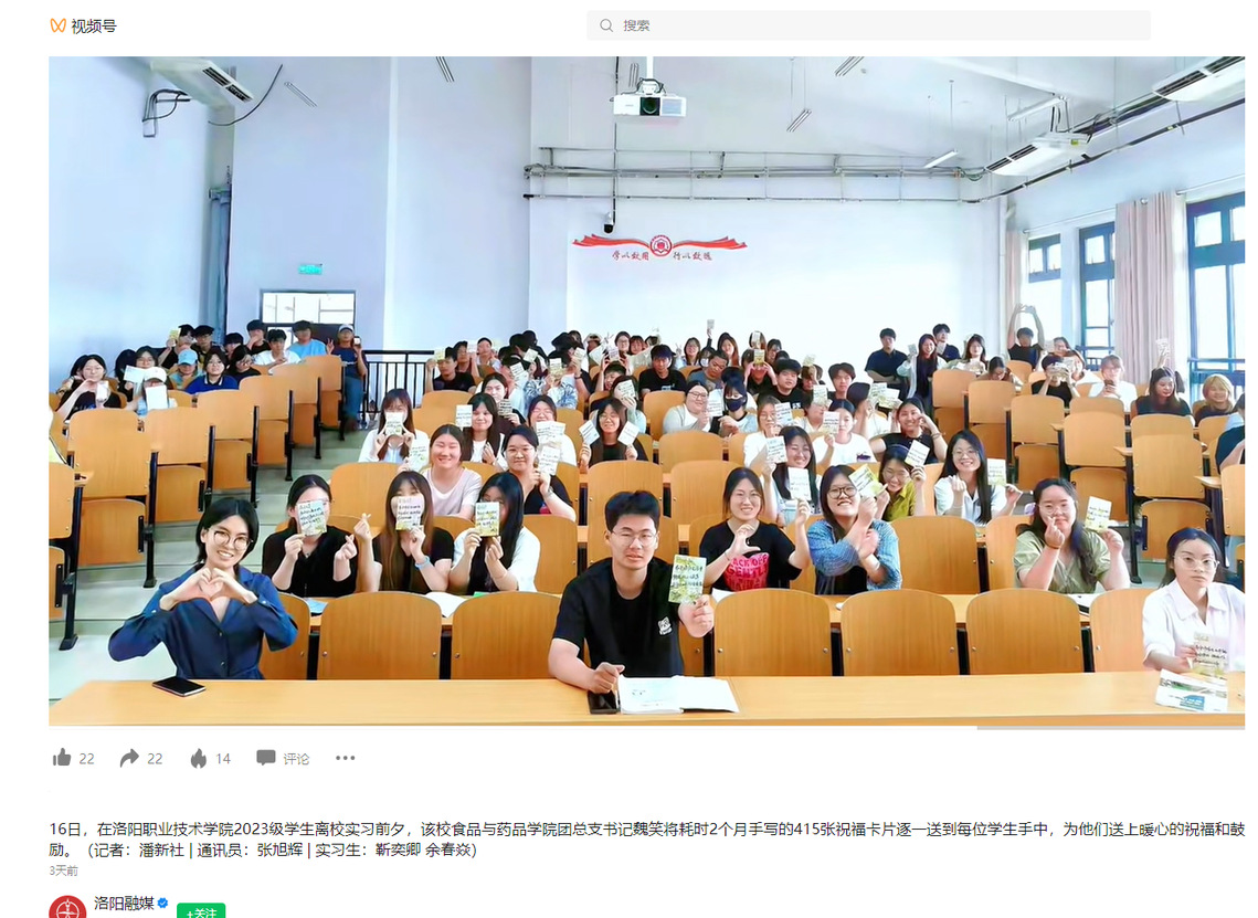 洛阳融媒:16日,在星空彩票在线登录2023级学生离校实习前夕,该校食品与药品学院团总支书记魏笑将耗时2个月手写的415张祝福卡片逐一送到每位学生手中,为他们送上暖心的祝福和鼓励。
